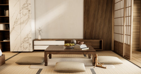Zen room interior wooden wall on tatami mat floor low table and armchairing
