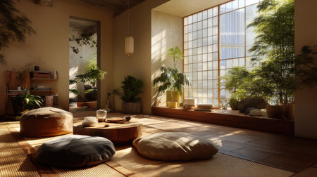 A minimalist sitting area with floor cushions and low tables, creating a Zen-inspired space for meditation and mindfulness practices.