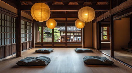 A serene Japanese interior featuring soft lanterns and comfortable cushions. The warm wooden elements enhance the tranquil atmosphere, inviting relaxation.