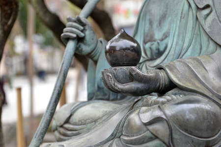 Close up of Buddha statue with green leaves at Daishion temple at Miyashima, Japan