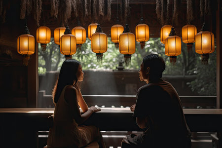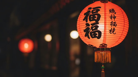 Vibrant red lanterns with Chinese calligraphy hang in a dimly lit room with wooden accents