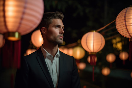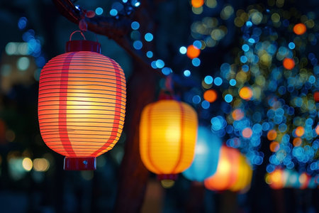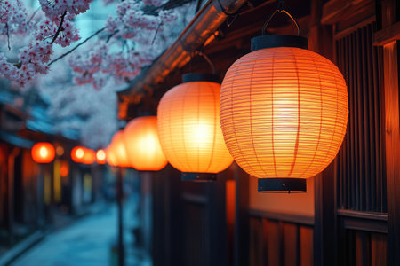 Paper lanterns under the cherry blossom tree in the evening