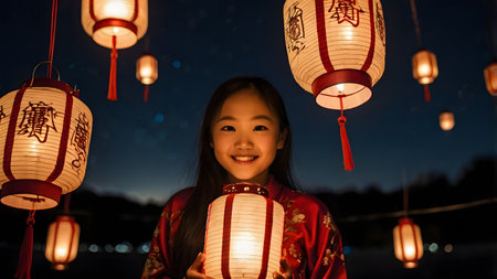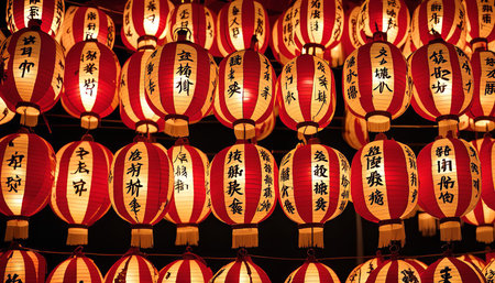 A close-up view of traditional Chinese lanterns, red and white with intricately Chinese characters, illuminated against a dark background, creating a festive atmosphere.