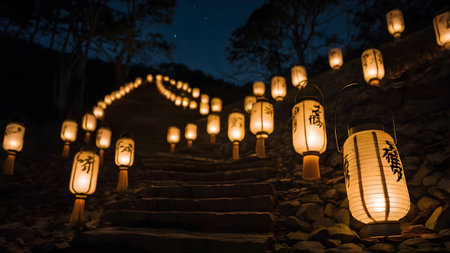 Japanese lanterns are traditional lighting devices made from materials like paper, silk, or metal, often framed with bamboo or wood.