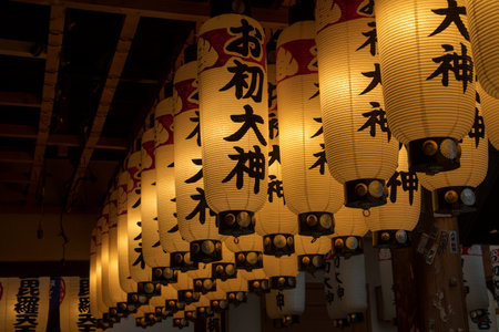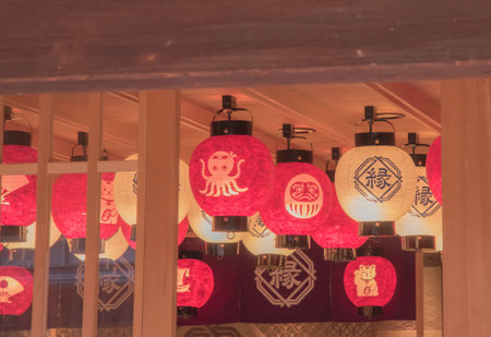 Sendai; Japan - 31 Dec 2019: Beautiful Japanese Lanterns light decorated around Osaki Hachimangu Shrine.