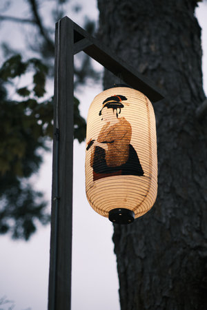 Japanese paper lantern on blurred background with bronze statue.