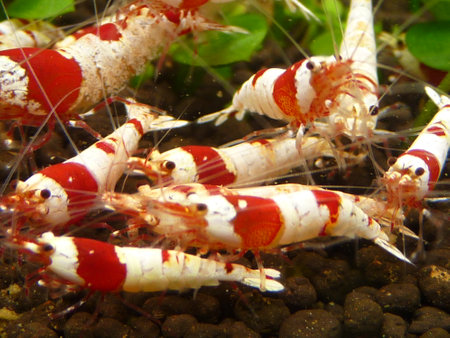 Red fancy tiger dwarf shrimp with main white color on aquatic soil with other dwarf shrimp in fresh water aquarium tank. Red fancy tiger shrimp are a mix between tiger and crystal red shrimp.