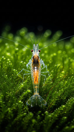 Sunkist orange yellow dwarf shrimp on green grass or aquatic moss