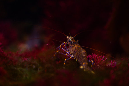 Beautiful underwater scene with red shrimp in aquarium in Dusseldorf, Germany. Tropical scenery.