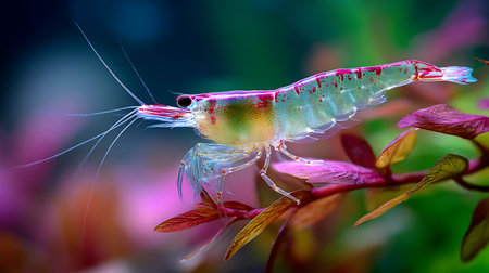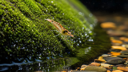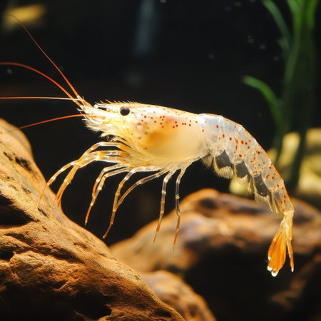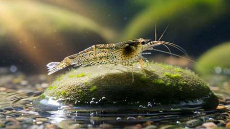 A vibrant freshwater shrimp navigates its rocky environment showcasing its unique colors and delicate antennae in an aquarium setting.
