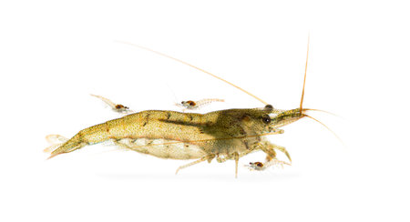 Mother and babies freshwater shrimp, Atyaephyra desmaresti, Caridine, on white