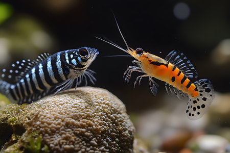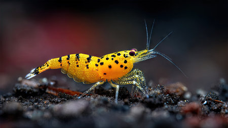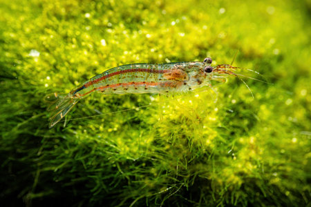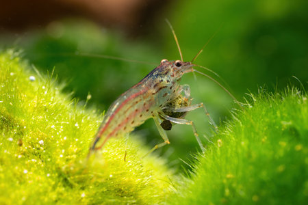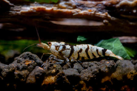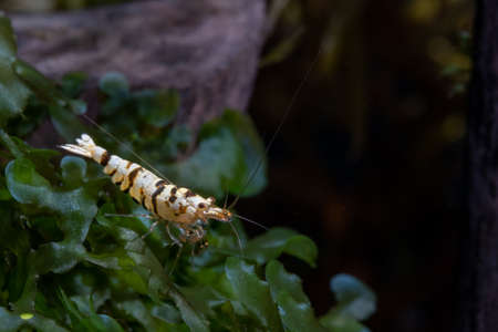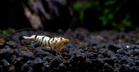 Tiger dwarf shrimp look for food in aquatic soil new molt of shrimp. Concept of little beautiful animals help relaxation.