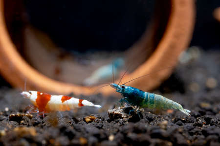 Blue bolt dwarf shrimp eat food on aquatic soil and stay among other types shrimp in front of earthenware decorations in fresh water aquarium tank. Concept of little beautiful animals help relaxation.