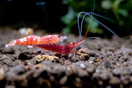 Crystal red wine dwarf shrimp look for food in aquatic soil in freshwater aquarium tank.