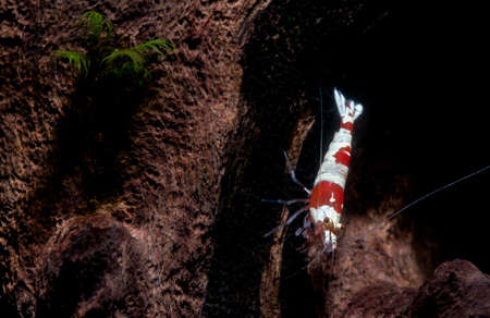 Red orchid sulawesi dwarf shrimp look for food in volcanic rock or aquatic stone of fresh water aquarium tank with the decoration as background.