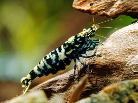 bright, freshwater prawn with black stripes - tiger in the aquarium