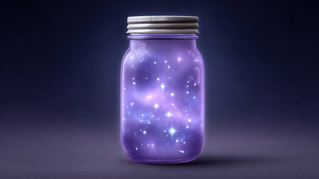 This enchanting image features a jar filled with a sparkling galaxy, showcasing shimmering stars in a captivating purple glow, evoking dreams and imagination.