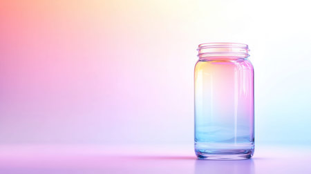 A clear glass jar is illuminated by a soft rainbow gradient, creating a minimalist and visually appealing composition.