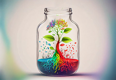 Glass jar filled with glowing bioluminescent plankton. Concept of nature, science, and magical discovery.