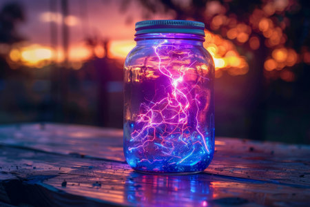 An electrifying blue lightning effect encapsulated in a jar, contrasting with the warm tones of a sunset.