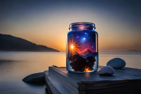 A glass jar with a sun setting in the background, AI