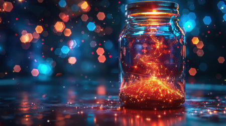 A mesmerizing glass jar filled with swirling lights and glowing particles creates an enchanting atmosphere, perfect for artistic and creative projects.