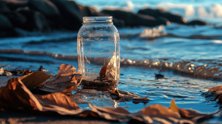 A glass jar rests on the sandy beach, filled with water and surrounded by colorful autumn leaves, creating a serene coastal atmosphere at sunset.