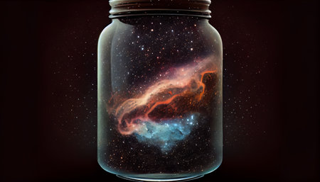 A delicate glass jar floats in deep space, containing a mesmerizing swirling galaxy of glowing stars and cosmic dust.