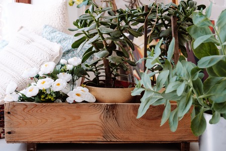 Succulents on the windowsill in the apartment, house cleanliness concept