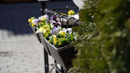 Close-up colored pansy flowers flowerpots summer terrace cafe.Decorative flower pots with spring flowers of viola cornuta.Pansies flower pots hang on fence spring garden.Flowering garden,Easter decor