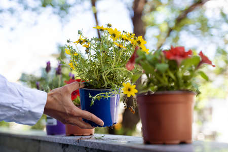 closeup of Caucasian woman hands arranging fresh beautiful flower pots on the balcony in the morning with trees in the background