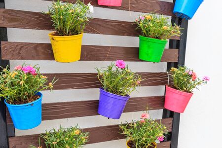 Portulaca oleracea in color planter box hanging on wooden wall. Garden decoration