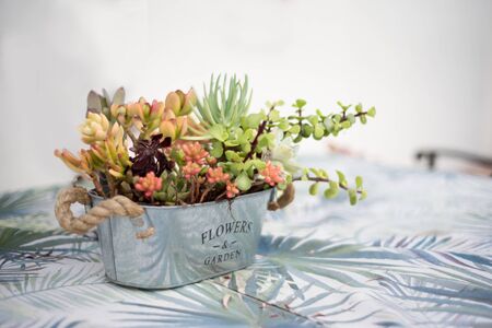 Colorful succulents in retro tin container on garden table with plenty of copy space