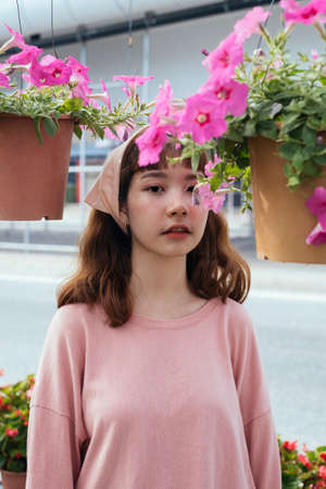 Brunette girl in beige headband and pink long sleeve t-shirt standing at the hanging petunia pot.