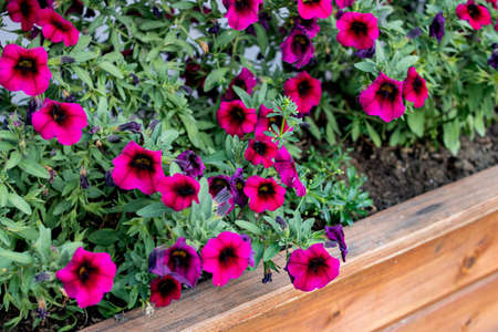 Petunias close up. Beautiful blue petunia flowers in bloom, outdoor in the garden