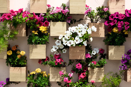 Facade Wall Decorated with Garden Flowers in Wooden Boxes closeup Outdoors