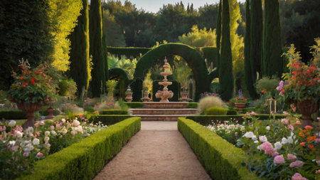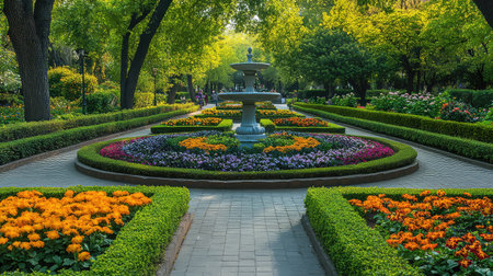 A picturesque garden featuring a grand fountain at its center, surrounded by vibrant flower beds and lush green trees. Ideal for nature lovers.