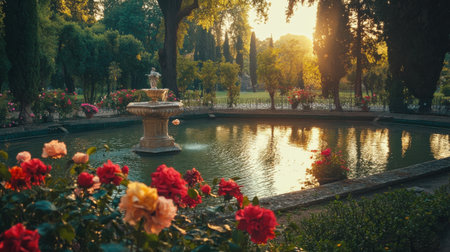 A peaceful garden showcases a beautiful fountain at sunset, with vibrant roses adding a splash of color around the water. The scene evokes calmness and natural beauty.