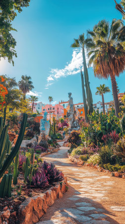 A winding pathway through a botanical garden lined with colorful blooms and palm trees invites visitors to explore the lush, tranquil surroundings under clear blue skies.