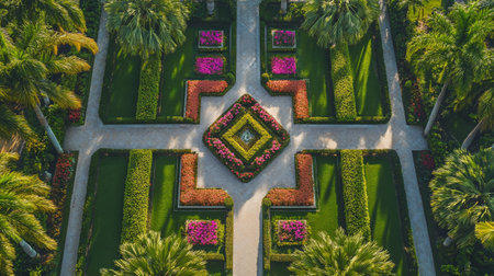 Aerial view of beautiful ornamental garden with palm trees and flowers