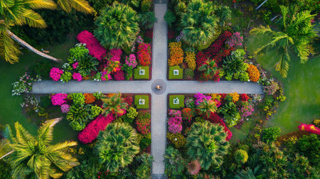Stunning aerial photograph of a beautifully arranged botanical garden, filled with colorful blooms and lush greenery, creating a tranquil natural oasis.