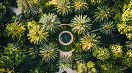 An aerial perspective reveals a meticulously designed circular garden. A central circular fountain with deep blue water is the focal point, surrounded by a geometric pattern of light-colored pathways radiating outwards. Perfectly manicured spherical hedges and neatly trimmed bushes create a symmetrical The garden is enclosed by a dense ring of lush green trees, their vibrant foliage creating a natural frame. The scene is bathed in bright daylight, highlighting the rich green hues and the...