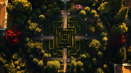 Aerial view of green garden labyrinth. Mysterious landscape design. Generative AI.