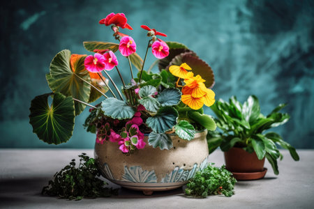 a houseplant surrounded by colorful blooms in a concrete flowerpot, created with generative ai