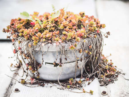 Rectangular arrangement of succulents, cactus succulents in a planter, above view, toning.