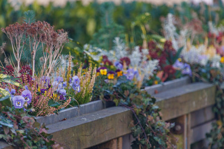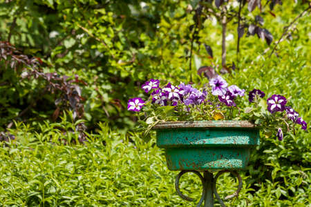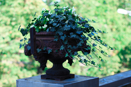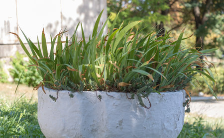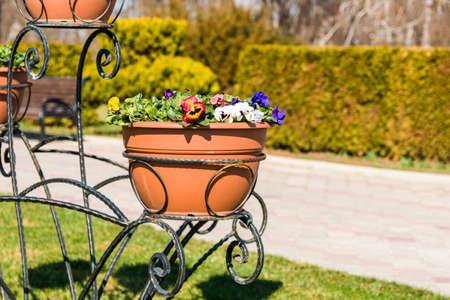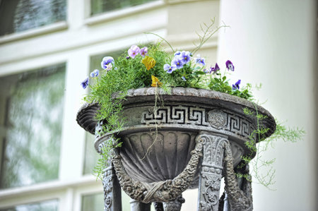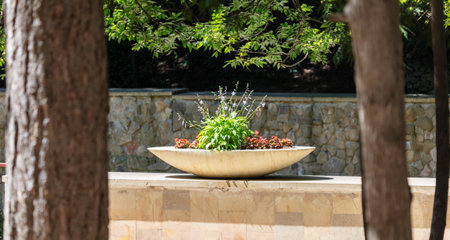 Big flower pot. Planter with Flowers and Plants. Big flower pot on city street. Patio outside decoration elements. Street decoration. Plants and flowerbed in the city in a summer. Street photo, nobody