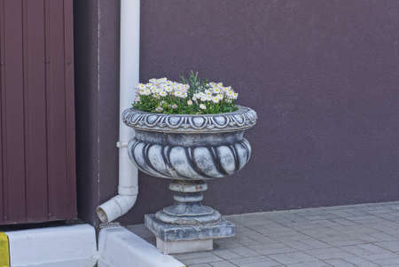 one gray large concrete flowerpot with white flowers stands on the sidewalk against a brown wall on the street