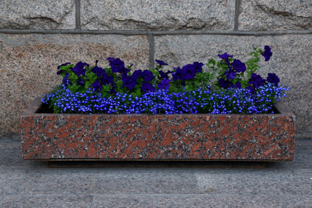 Flower beds in the summer city. Stone flower beds with beautiful flowers.
