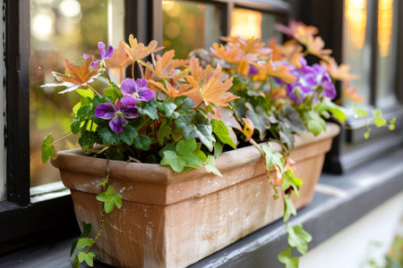 Vibrant purple pansies and heuchera bring color to a terracotta flower box placed on a window sill