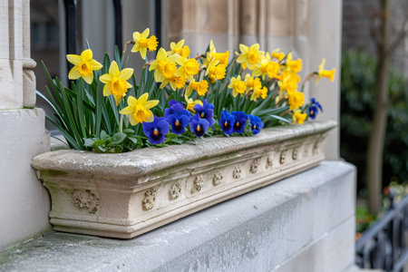 Yellow daffodils and blue pansies bring color to a window box on a city street